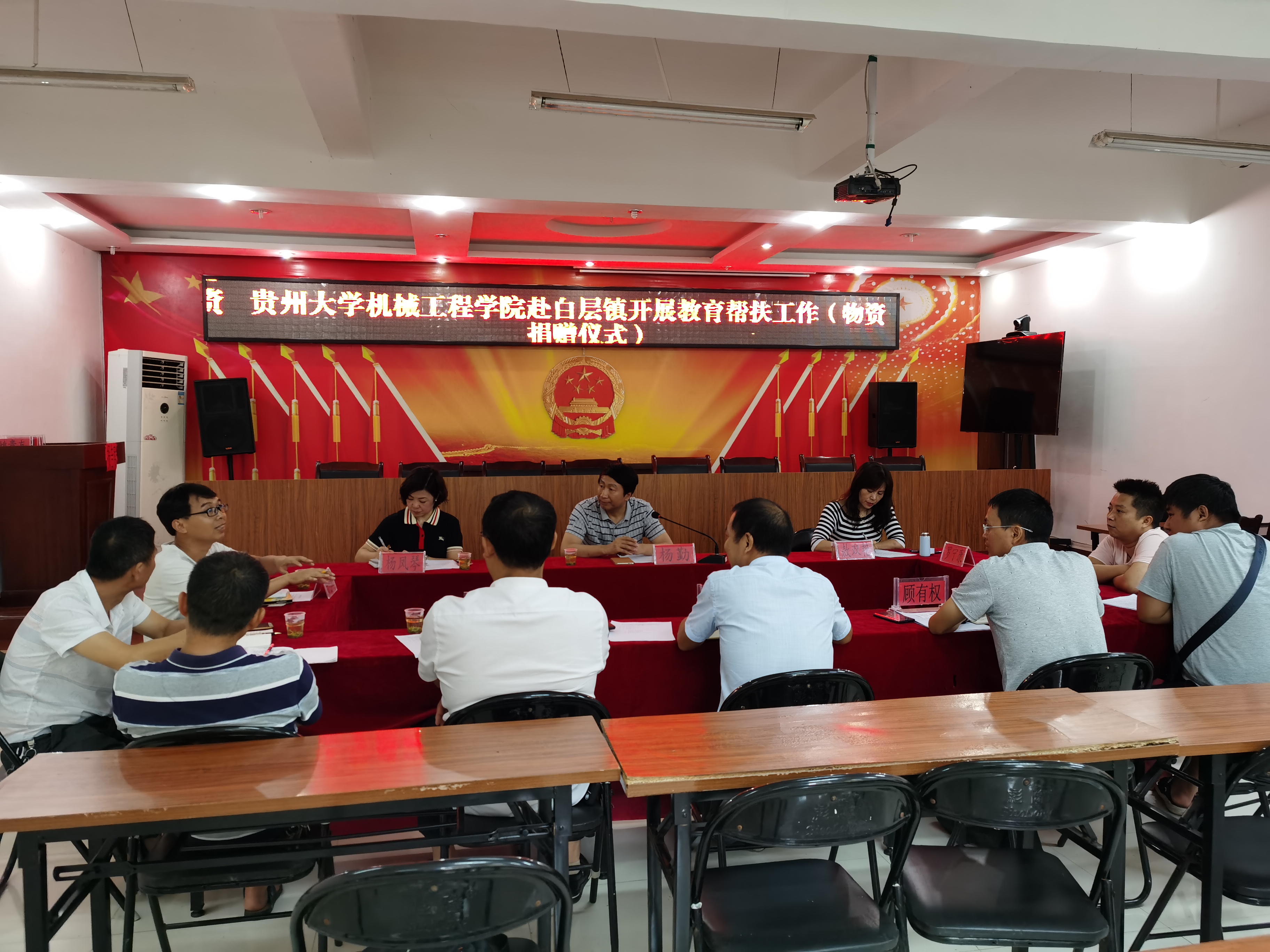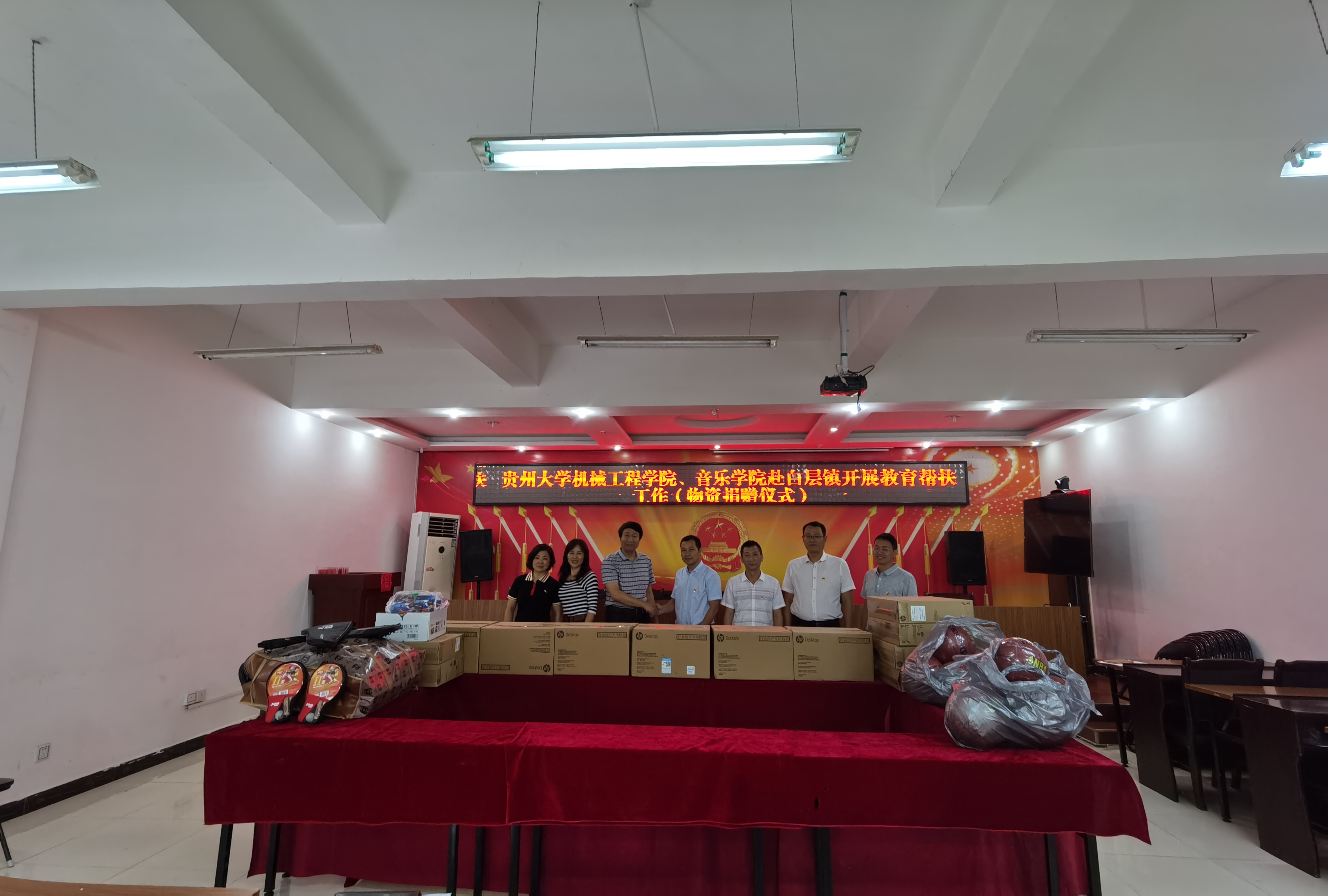 为认真落实《中共金沙威尼斯欢乐娱人城委员会助力脱贫攻坚“一院一品”行动计划实施方案》,2020年7月2日,金沙威尼斯欢乐娱人城副院长杨勤,办公室主任敖双艳,音乐学院办公室主任杨风琴等携国药集团同济堂(贵州)公司姜志海赴贵州省贞丰县白层镇开展教育帮扶工作接洽暨物资捐赠仪式,就助力脱贫攻坚开展工作接洽。贞丰县白层镇人大主席刘官浩、党委副书记左德健、组织委员顾有权等镇领导与两个学院一行人进行了座谈。